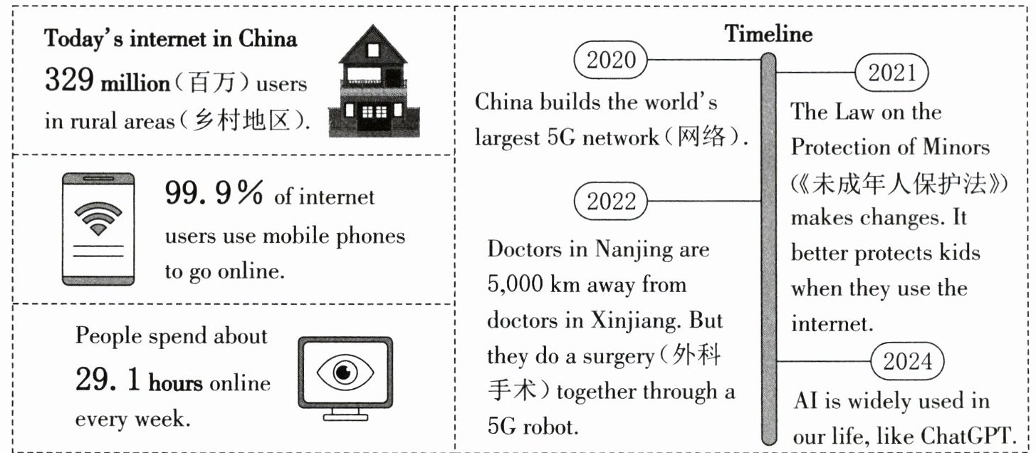 | People spend about 29.1 hours online every week. | 2022 Doctors in Nanjing are 5,000 km away from doctors in Xinjiang. But they do a surgery(外科手术) together through a 5G robot. |