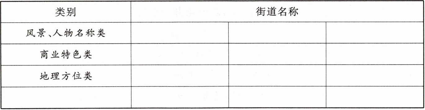 选择你家所在的社区、学校周边或者城市的某个片区,开展调查,分类记录街道名称,如风景、人物名称类的“黄山路”、商业特色类的“美食街”、地理方位类的“沿江路”等。