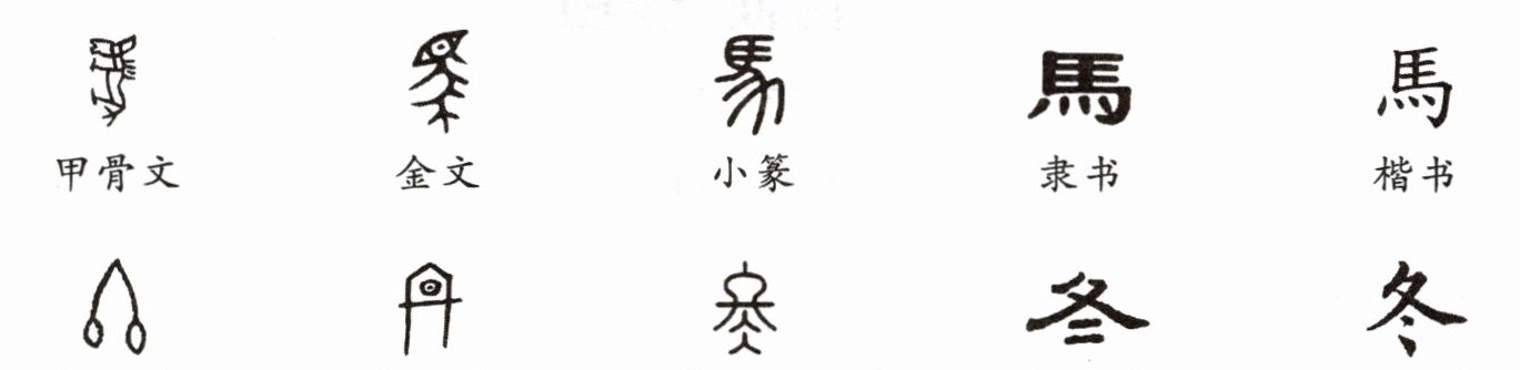 4 汉字有着悠久的历史,书法是在汉字字体基础上形成的独特艺术种类。回顾“马”字的演变过程,再看看“冬”字的演变过程,选出对应的字体。