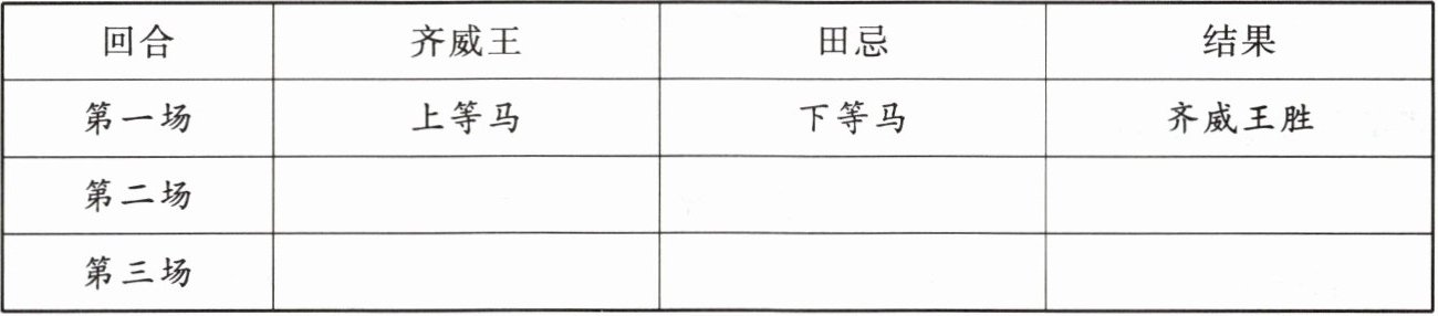 1 你还记得田忌赛马的故事吗?孙膑是怎样巧妙地安排马的出场顺序从而让田忌获胜的?请补全下面的表格并回答问题。