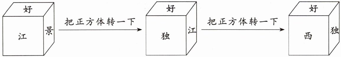 再看,与“江”相邻的面有“好”“景”“独”“风”(已推出“好”对面是“风”),所以“江”的对面是“西”。