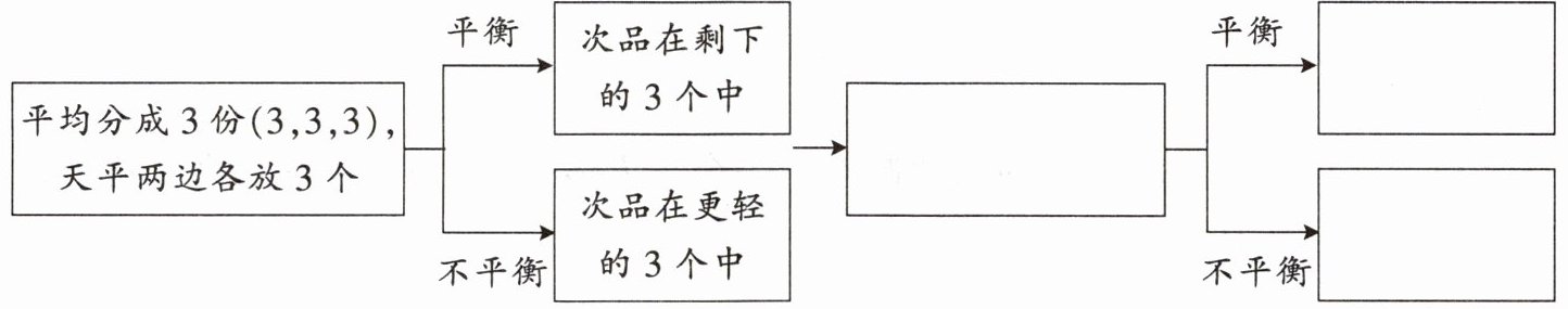 有9个同样的乒乓球,其中1个是次品(次品轻一些)。用天平称,至少称几次能保证找出这个次品?请把下面的示意图补充完整。