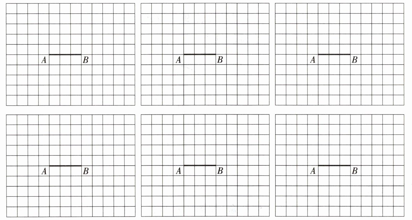【解析】:利用旋转知识,将线段AB绕点A顺时针旋转90°,再旋转90°,再旋转90°,可得到一个正方形图案;将线段AB绕其中点旋转180°,重复操作可得到不同图案;先在线段AB基础上绘制一个三角形(如以AB为底边,作等腰三角形),再将整个图形绕AB中点旋转180°等多种方式创作图案。