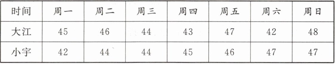 (2)五(1)班要选拔一名学生参加仰卧起坐比赛,李老师对大江和小宇一周仰卧起坐的成绩进行了统计,情况如下表所示。