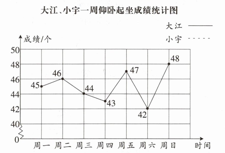 ②大江这一周平均每天做()个仰卧起坐,小宇这一周平均每天做()个仰卧起坐。