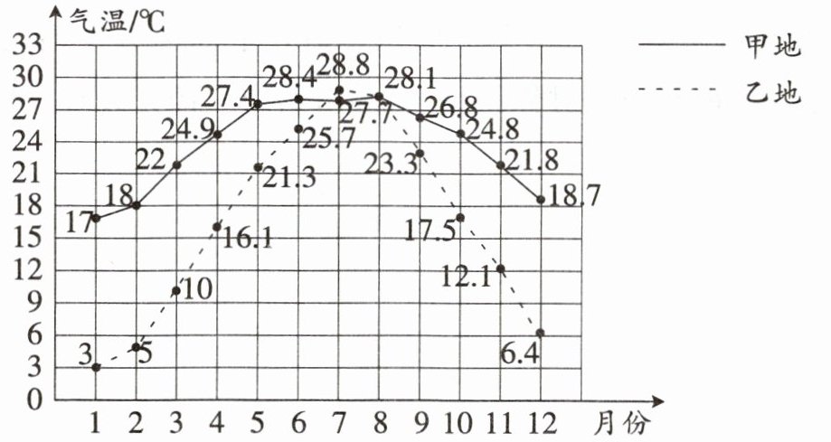 (4)甲、乙两地月平均气温如下图所示。从统计图看,乙地在()的平均气温变化幅度最大。一种树莓的主要生长期为4月,其生长过程中最适宜的平均温度为10~20℃,仅考虑温度因素,这种植物适合在()种植。