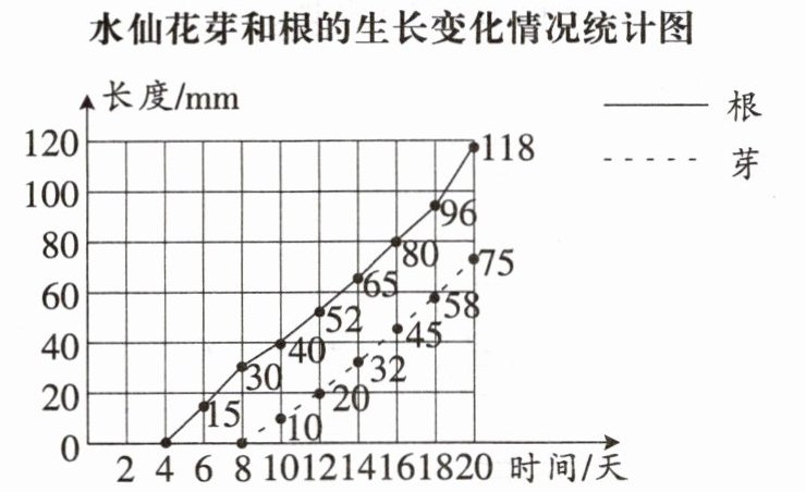 大江在水池边养了一个水仙花球,他每隔一天观察一次,测量芽和根的长度,并将观察结果制成了下面的统计图。