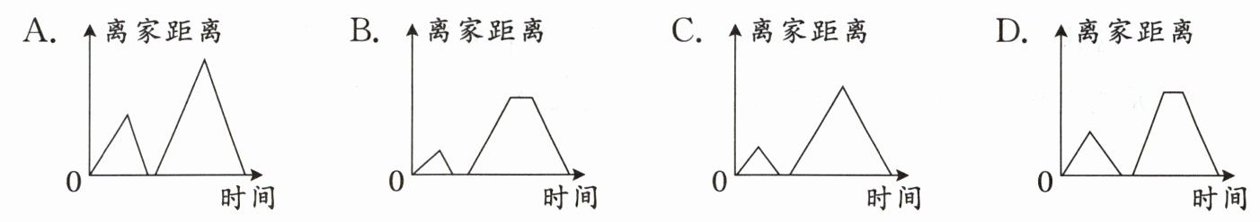 (3)西西今天从家出发去奶奶家,当她走了大约$\frac {1}{3}$的路程时,发现忘记拿给奶奶的礼物。于是她立即返回家,拿好礼物再去奶奶家。吃完晚饭后,她再回自己家。下面能反映出西西今天行程的是()。