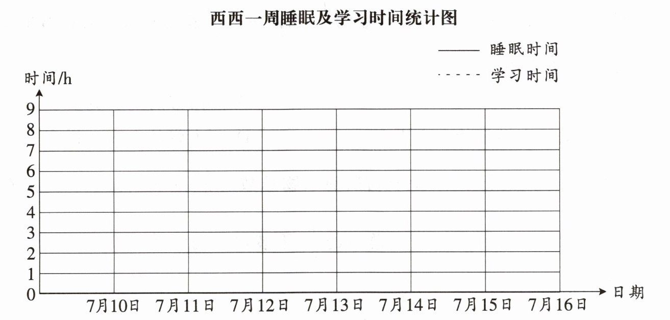 (1) 绘制复式折线统计图时,先确定横轴表示日期,纵轴表示时间(h)。然后根据表格中的数据,在对应的日期和时间位置描点,对于睡眠时间用实线连接各点,学习时间用虚线连接各点。