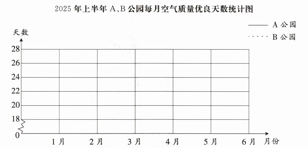 (1)请依据上表中的数据,绘制出2025年上半年A、B两个公园每月空气质量优良天数的复式折线统计图。