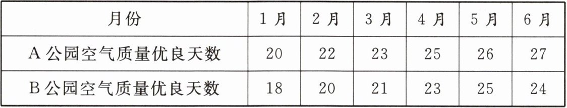 “小小环保人”志愿队为了解本市A、B两个公园的生态环境变化情况,对2025年上半年这两个公园的空气质量优良天数进行了统计,数据如下表所示。