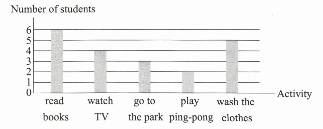 3 Nancy抽出一天时间调查了20名同学在假期周末常做的事情,并将结果绘制成条形统计图。请根据统计图判断下列句子的正误,正确的写“T”,错误的写“F”。