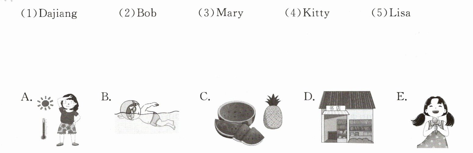 2 正值炎炎夏日,大江和朋友们喜欢夏天吗? 听对话,将人名与相应的图片连线。