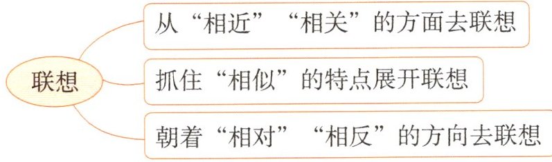联想:从“相近”“相关”的方面去联想、抓住“相似”的特点展开联想、朝着“相对”“相反”的方向去联想
