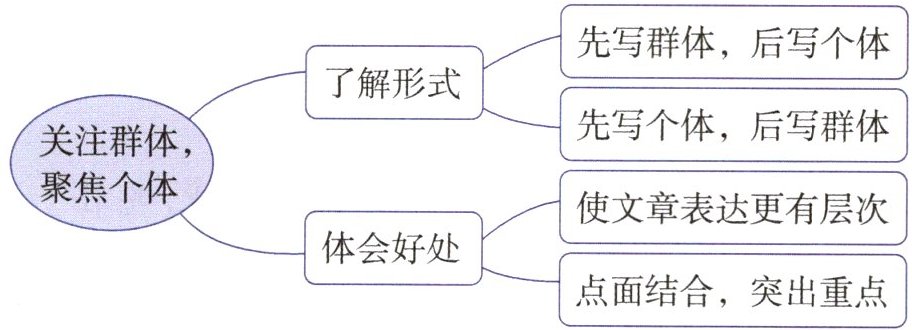 关注群体,聚焦个体:了解形式(先写群体,后写个体;先写个体,后写群体)、体会好处(使文章表达更有层次;点面结合,突出重点)
