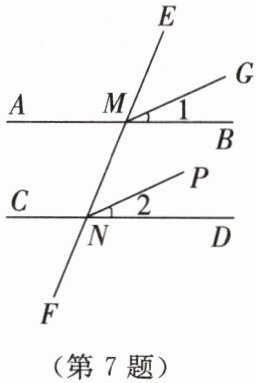 7. 如图所示,直线AB和直线CD被直线EF所截,$ ∠BMN = ∠DNF $,$ ∠1 = ∠2 $. 请你判断MG与NP是否平行,并说明理由.