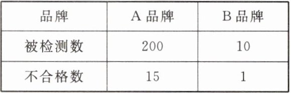 (2) 不同意,因为B品牌被检测数$10$太小,样本容量过小,不能准确反映B品牌的不合格率情况,结果可能具有较大偏差。