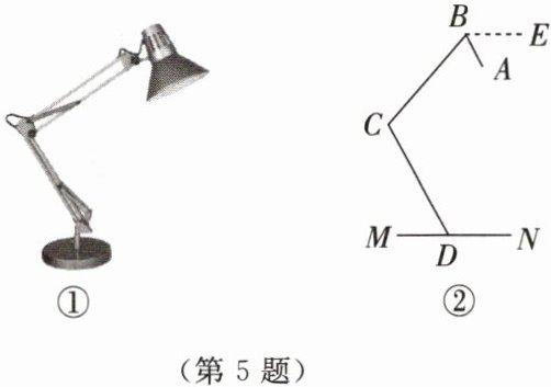 5. 图①是一盏可以伸缩的台灯,它的优点是可以通过变化伸缩,找到合适的照明角度,图②是这盏台灯的示意图.已知台灯水平放置,当灯头AB与支架CD平行时可达到最佳照明角度,此时支架BC与水平线BE的夹角$∠CBE= 130^{\circ }$,两支架BC和CD的夹角$∠BCD= 110^{\circ }$.