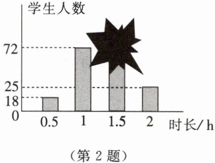 2. 刘老师从全校2000名学生回收的每天体育锻炼时长的问卷中随机抽取部分学生的问卷,并将结果统计后绘制成条形统计图,如图所示,其中一部分被墨迹遮盖.已知每天锻炼时长为1h的学生人数占样本总人数的36%,则下列说法正确的是()