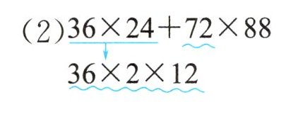 思路点拨 这两道算式都是两个积的和的形式,如果乘数中有存在倍数关系的数,那么就可以先转化出相同的乘数,再用乘法分配律进行简便计算。