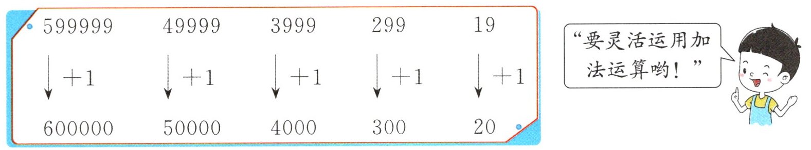 例1 巧算:$599999+49999+3999+299+19+5$。