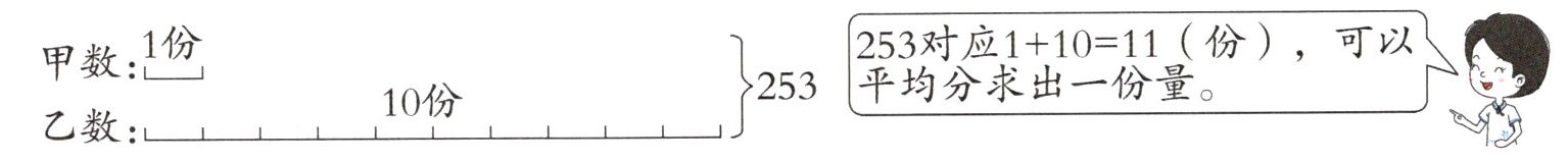 253对应$1+10= 11$(份),可以平均分求出一份量。