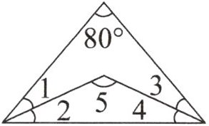 4.(仿例练习)如图,等腰三角形的顶角是$80^{\circ },∠1= ∠2,∠3= ∠4$,求$∠5$的度数。