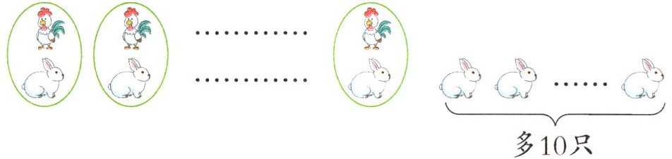 思路点拨 如图,因为兔比鸡多10只,所以如果“抓走”多的10只兔,那么兔和鸡的只数就相等了。每只兔有()条腿,“抓走”10只兔,总腿数会减少()条,还剩下()条腿。再把剩下的1只鸡和1只兔分为一组,每组有()条腿,可以分成()组,每组有1只鸡、1只兔,所以鸡有()只,兔有()只。加上之前的10只兔,兔共有()只。