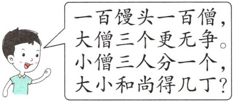 例2 我国古代数学名著《算法统宗》中记载了一道有趣的“百僧百馍”问题。100个和尚吃100个馒头。大和尚一人吃3个,小和尚3人吃一个。大、小和尚各多少人?