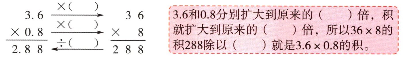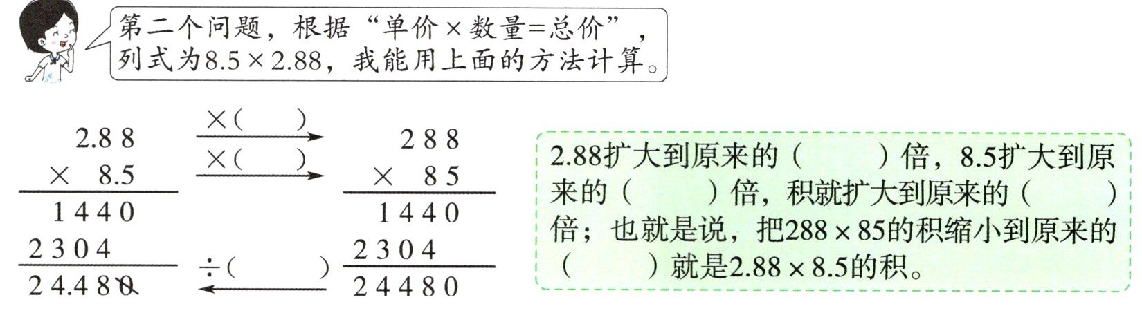 2.88扩大到原来的()倍,8.5扩大到原来的()倍,积就扩大到原来的()倍;也就是说,把$288×85$的积缩小到原来的()就是$2.88×8.5$的积。