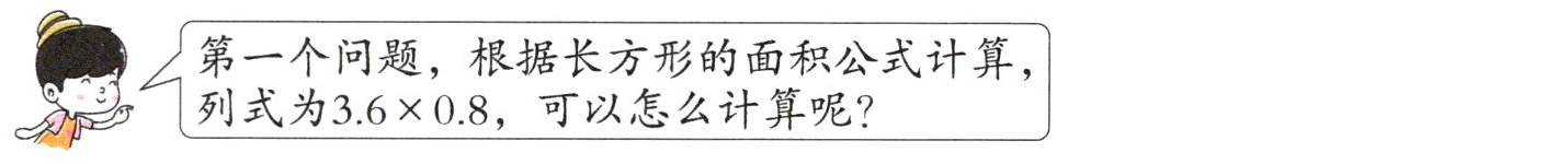 第一个问题,根据长方形的面积公式计算,列式为$3.6×0.8$,可以怎么计算呢?