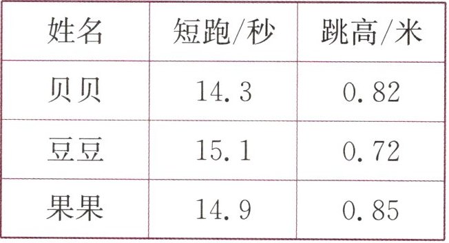 1. (易错题)在一次体育课上,贝贝、豆豆和果果的短跑和跳高成绩如下。谁跑得最快?谁跳得最高?