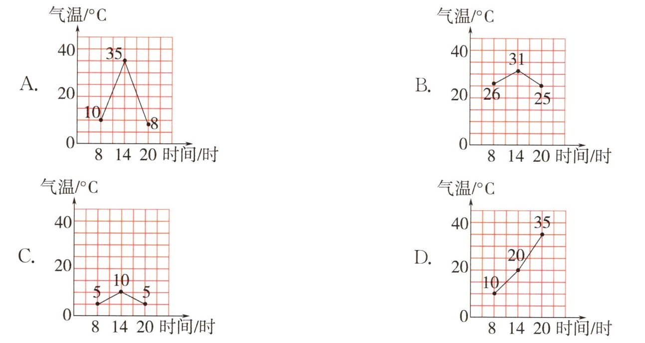 4. (传统文化)与“早穿棉袄午穿纱,晚围火炉吃西瓜”这句话对应的我国某地区某日早、中、晚气温变化情况统计图是()。