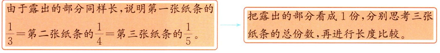 把露出的部分看成1份,分别思考三张纸条的总份数,再进行长度比较。