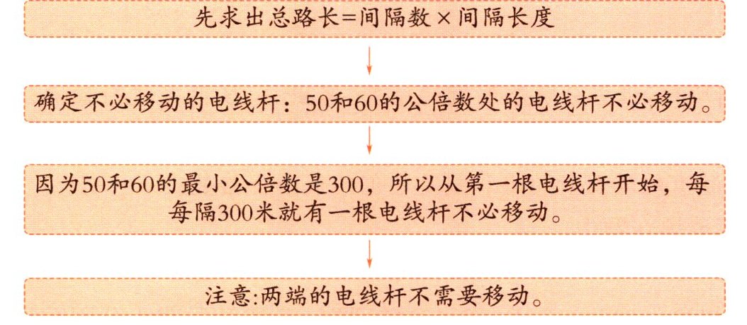 5. (变式提升)在A地到B地的一段路上,一共有25根电线杆,原来每两根电线杆之间的距离是50m,现在要改成每两根电线杆之间的距离是40m。除两端的两根电线杆不需要移动外,中间还有多少根电线杆不必移动?