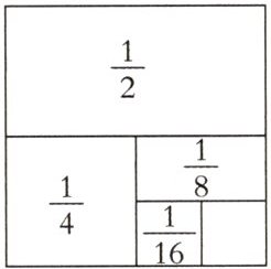 3.(仿例练习)看图直接写出计算结果:$ \frac { 1 } { 2 } + \frac { 1 } { 4 } + \frac { 1 } { 8 } + \frac { 1 } { 16 } = () $。