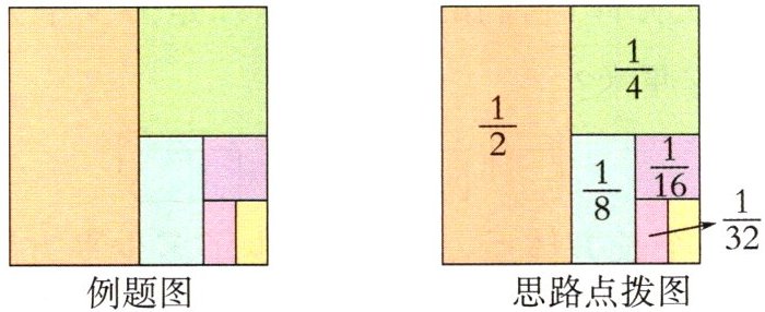 例2 “转化”是解决问题的策略之一,画图可以帮助我们找到转化方法。如图,可以算出:$ \frac { 1 } { 2 } + \frac { 1 } { 4 } + \frac { 1 } { 8 } + \frac { 1 } { 16 } + \frac { 1 } { 32 } = () - () = () $。