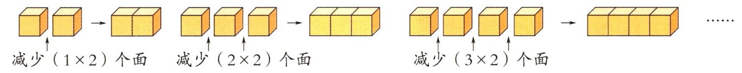 (3)示例:每增加一个小正方体,拼成的长方体的表面积就比这些小正方体的表面积之和减少2个正方形面的面积。假设小正方体的数量是a个,那么拼成长方体后,减少面的数量就是$[2×(a-1)]$个。每个面的面积×减少的面的数量=减少的表面积