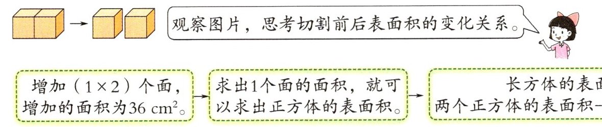 例2 把一个长方体切成两个完全相同的正方体,表面积增加了36平方厘米。原来长方体的表面积是多少?
