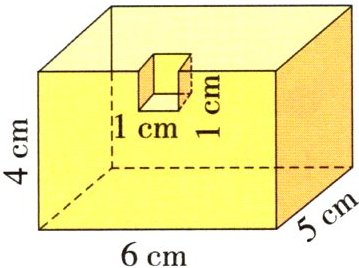 体积:$ 6 \times 5 \times 4 - 1 \times 1 \times 1 = 119 ( \mathrm { c m } ^ { 3 } ) $