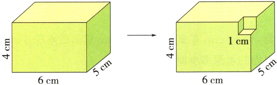 例2 如图,从长方体的一个顶点上挖去一个棱长为1cm的小正方体,现在这个立体图形的表面积和体积各是多少?