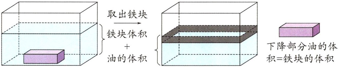 例2 将一块长14cm、宽10cm、高3cm的长方体铁块完全浸没在一个长方体油箱中,取出铁块后,油面的高度下降了2.1cm。这个长方体油箱的底面积是多少平方厘米?