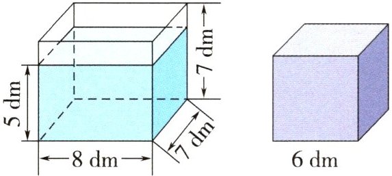 5.(变式提升)如图,一个长方体玻璃缸中水深5dm,将一块棱长是6dm的正方体铁块投入水中,玻璃缸里的水会溢出多少立方分米?