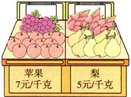 2. (生活体验)走进水果店里,妈妈买了苹果和梨各$\frac {3}{4}kg$,一共支付了多少钱?(用两种方法解答)
