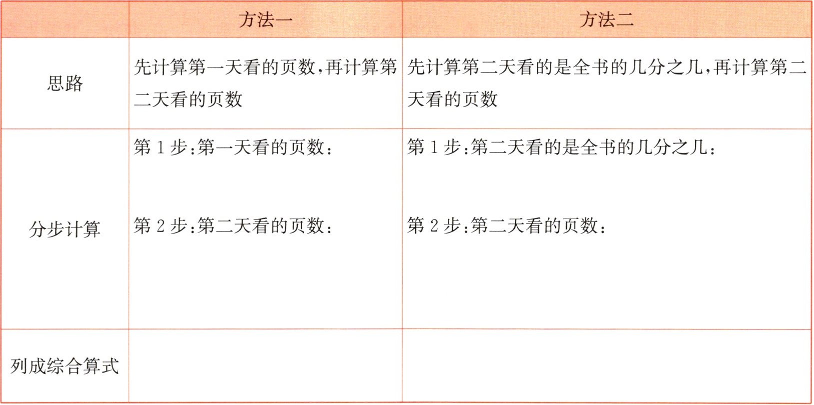 ③第二天看的是第一天的$\frac {()}{()}$。 ④要求的是第()天看的页数。