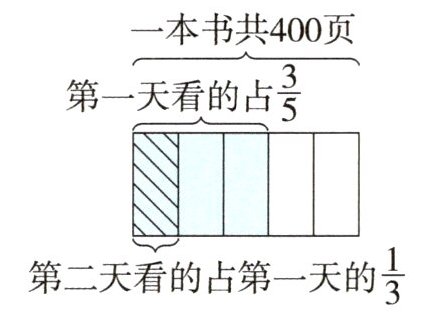 例 亮亮看一本400页的书,第一天看的占全书的$\frac {3}{5}$,第二天看的是第一天的$\frac {1}{3}$。第二天看了多少页?