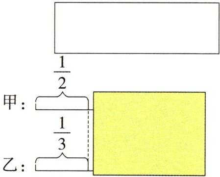示例:补完甲、乙的线段图,甲露出了$\frac{1}{2}$,说明挡住的和现在的一样长。乙露出了$\frac{1}{3}$,说明挡住了同样长的2段。所以乙更长一些