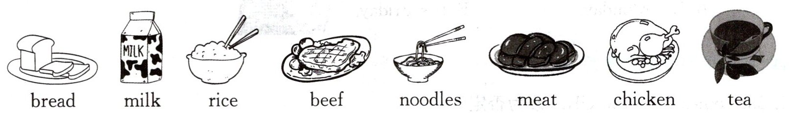 第三行:晚餐时间假设是 18:00,食物可以选择 noodles(面条)、chicken(鸡肉)等(答案不唯一,根据个人实际情况填写)。