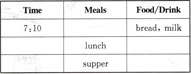 | 18:00 | supper | noodles, chicken(答案不唯一) |