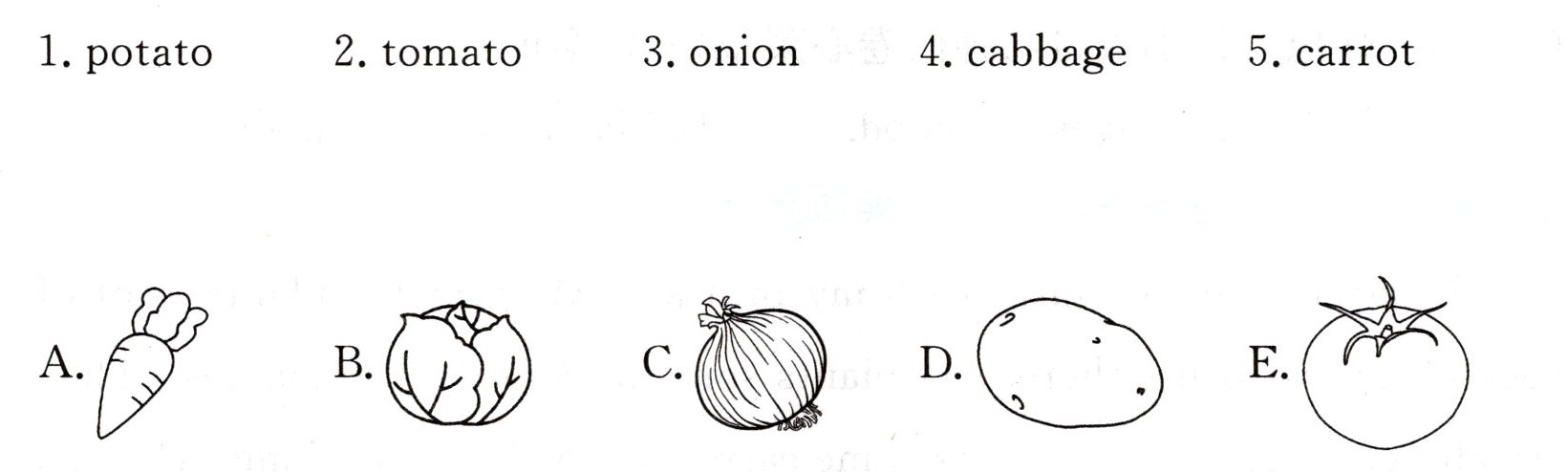 1. potato 2. tomato 3. onion 4. cabbage 5. carrot